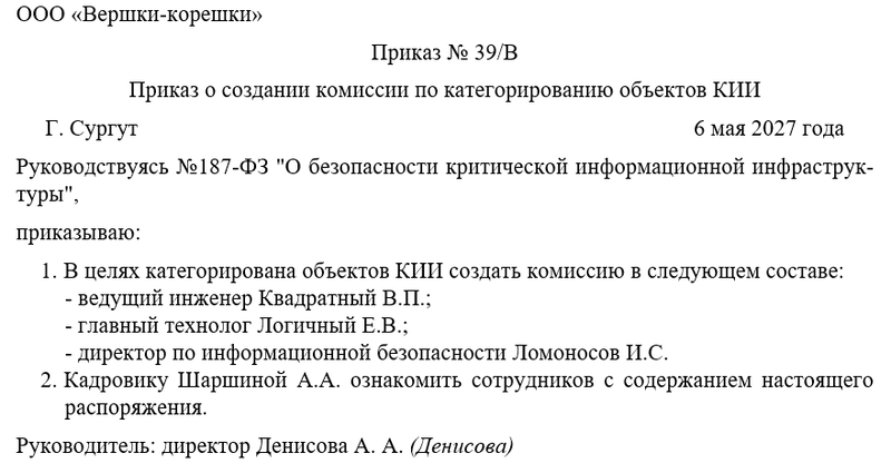 Следующим шагом руководитель объявляет о создании комиссии по категорированию объектов КИИ. Ссылка на нормативную базу обязательна. Также необходимо решить вопрос о том, кто их работников будет следить за исполнением распоряжения. Чаще всего контроль за исполнением распоряжения директор оставляет за собой.