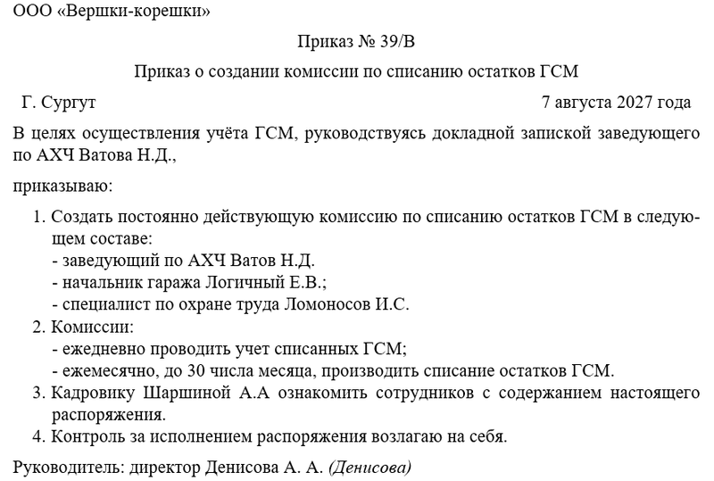 Первый пункт создает комиссию с указанием ФИО, должностей председателя и всех членов. Второй пункт ставит перед комиссией конкретные задачи: провести осмотр и замер остатков ГСМ; установить причины и точные объемы списания; определить наличие виновных лиц; составить акт списания по форме МХ-15. Здесь же устанавливается строгий срок выполнения этих задач. Третий пункт назначает ответственных за обеспечение работы комиссии и за ознакомление участников процесса с приказом.