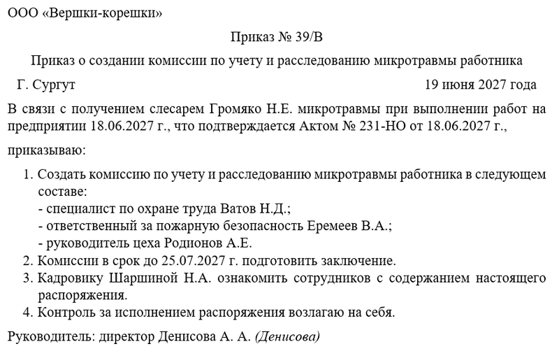 Приказ директора закрепляет создание комиссии и ее полномочия. Он определяет порядок проведения расследований и ответственность участников процесса. Этот документ служит официальным основанием для действий сотрудников по учету травм.