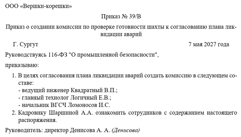 Следующим шагом руководитель объявляет о создании комиссии по организации проверок готовности шахты к согласованию ПЛА. Ссылка на нормативную базу обязательна. Также необходимо решить вопрос о том, кто их работников будет следить за исполнением распоряжения. Чаще всего контроль за исполнением распоряжения директор оставляет за собой.