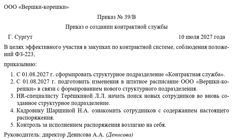 Приказ Генерального директора о создании контрактной службы является первичным правовым актом, легитимизирующим ее существование и деятельность. Он вступает в силу с даты подписания или с даты, указанной в тексте.