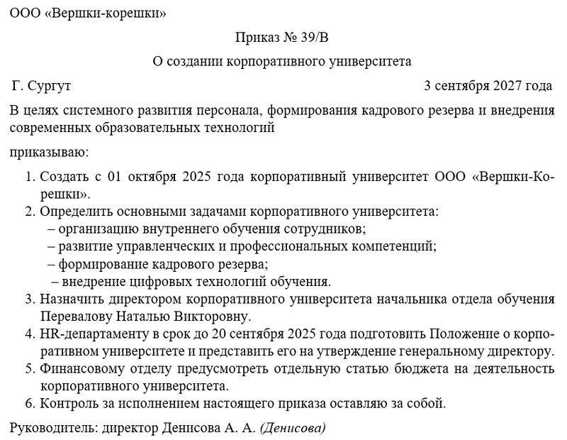 В тексте приказа обычно фиксируется дата и решение о создании корпоративного университета, его цели и задачи. К основным задачам относятся: организация внутреннего обучения, формирование кадрового резерва, развитие управленческих компетенций, внедрение современных образовательных технологий.