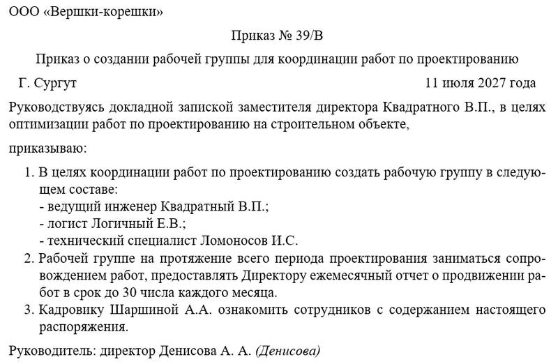 Приказ обязателен для исполнения всеми упомянутыми в нем сотрудниками и подразделениями. Он четко определяет зону ответственности группы и снимает эту задачу с общего руководства, делегируя ее на уровень специалистов. Приказ также служит основанием для включения работы в группе в должностные обязанности или планы работ сотрудников и для оценки их участия в проекте.