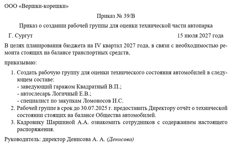 Приказ о создании рабочей группы для оценки технической части автопарка - это распоряжение руководства компании, санкционирующее формирование временного коллектива для комплексной проверки транспортных средств. В рамках настоящего материала мы рассмотрим назначение группы, суть оценки автопарка, вопросы мотивации, роль приказа и правила его оформления.