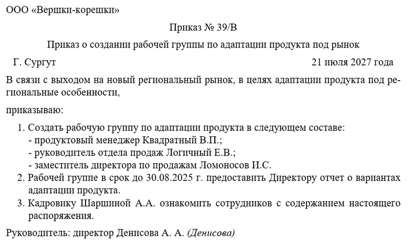 Бланк приказа о создании рабочей группы по адаптации продукта под рынок