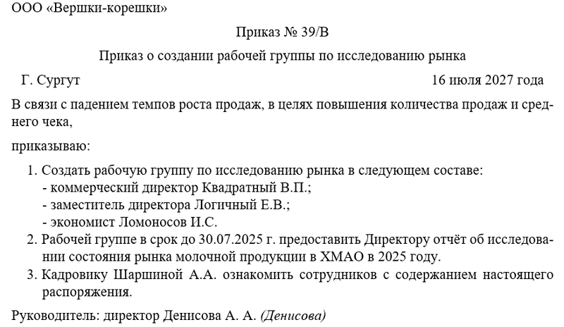 Бланк приказа о создании рабочей группы по исследованию рынка