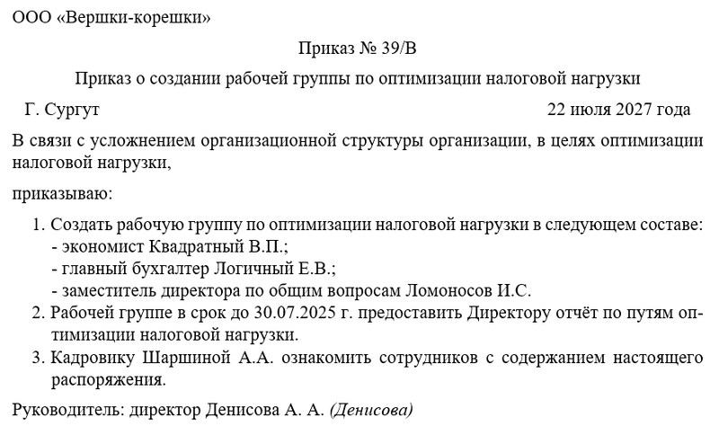 Приказ о создании рабочей группы по оптимизации налоговой нагрузки - это распорядительный документ руководства организации, санкционирующий формирование временного коллектива для разработки и реализации законных мер по снижению налоговых платежей без нарушения законодательства РФ. В рамках настоящего материала мы рассмотрим назначение группы, суть налоговой оптимизации, ключевые задачи, роль приказа и правила его оформления.