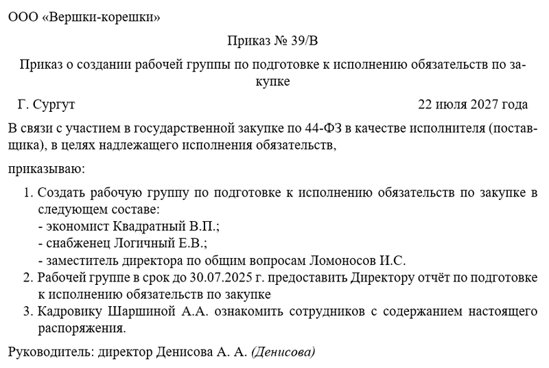 Приказ о создании рабочей группы по подготовке к исполнению обязательств по закупке - это распорядительный документ руководства организации, инициирующий формирование временного коллектива для планирования, координации и контроля действий, необходимых для надлежащего выполнения договорных обязательств, возникших в результате проведенных закупок (по 44-ФЗ, 223-ФЗ или корпоративным правилам). В рамках настоящего материала мы рассмотрим назначение группы, суть подготовки к исполнению, ключевые задачи, роль приказа и правила его оформления.