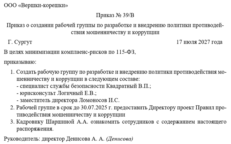 Приказ о создании рабочей группы по разработке и внедрению политики противодействия мошенничеству и коррупции — это распорядительный документ высшего руководства организации, санкционирующий формирование временного коллектива для создания и внедрения системы предупреждения, выявления и пресечения коррупционных и мошеннических действий. В рамках настоящего материала мы рассмотрим назначение группы, суть антикоррупционной политики, ключевые задачи, роль приказа и правила его оформления.