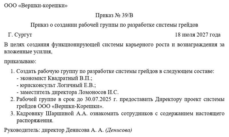 Приказ о создании рабочей группы по разработке системы грейдов — это распорядительный документ руководства организации, санкционирующий формирование временного коллектива для создания структурированной системы оценки должностей и установления справедливых уровней оплаты труда. В рамках настоящего материала мы рассмотрим назначение группы, суть системы грейдов, ключевые задачи, роль приказа и правила его оформления.