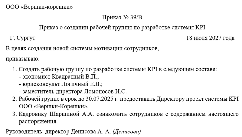 Приказ о создании рабочей группы по разработке системы KPI - это распорядительный документ руководства организации, санкционирующий формирование временного коллектива для создания системы ключевых показателей эффективности, призванной измерить прогресс в достижении стратегических и операционных целей. В рамках настоящего материала мы рассмотрим назначение группы, суть системы KPI, ключевые задачи, роль приказа и правила его оформления.