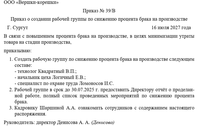 Бланк приказа о создании рабочей группы по снижению процента брака на производстве