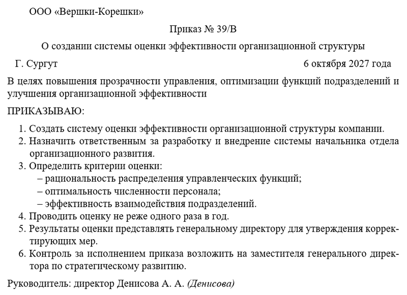 Приказ о создании системы оценки эффективности организационной структуры следует оформлять на фирменном бланке, используя официально-деловой стиль. Необходимо четко прописывать цели, задачи и обязанности, закреплять ответственных за внедрение и контроль, а также формулировать порядок использования результатов оценки.