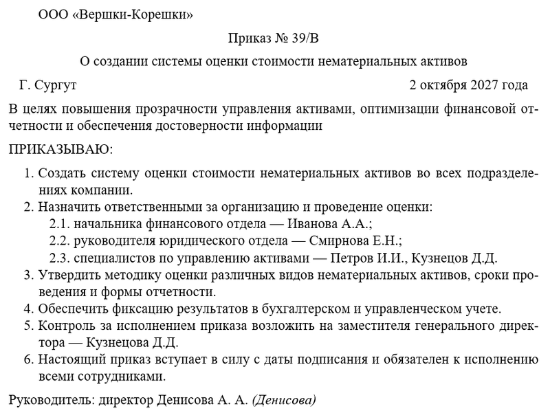 Приказ о создании системы оценки стоимости нематериальных активов оформляется в официально-деловом стиле с четкой структурой и нумерацией пунктов. Формулировки должны включать «ПРИКАЗЫВАЮ», «ВОЗЛОЖИТЬ», «ОПРЕДЕЛИТЬ».