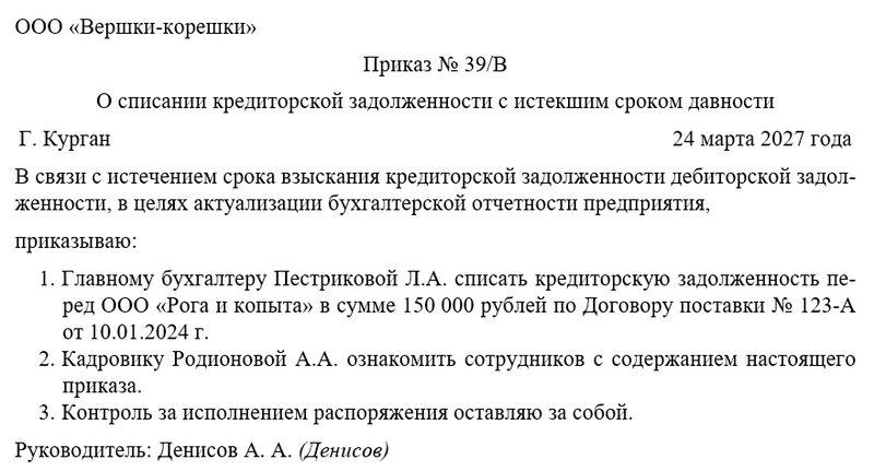 Бланк приказа о списании кредиторской задолженности с истекшим сроком исковой давности