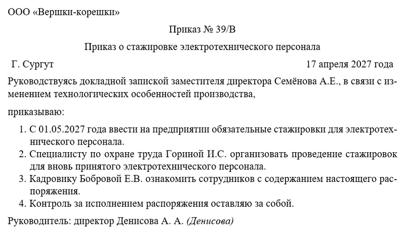 Следующим шагом руководитель объявляет о стажировке электротехнического персонала, а также назначает человека, который будет осуществлять контроль. Чаще всего контроль за исполнением распоряжения директор оставляет за собой.