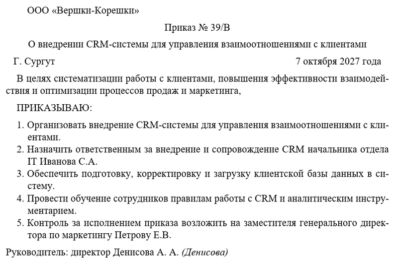 Приказ оформляется на фирменном бланке, подписывается руководителем, регистрируется в журнале приказов и доводится до сведения всех подразделений, участвующих во внедрении CRM, под подпись. В тексте приказа должны быть указаны цели документа, порядок действий, ответственные лица, сроки исполнения и механизм контроля.