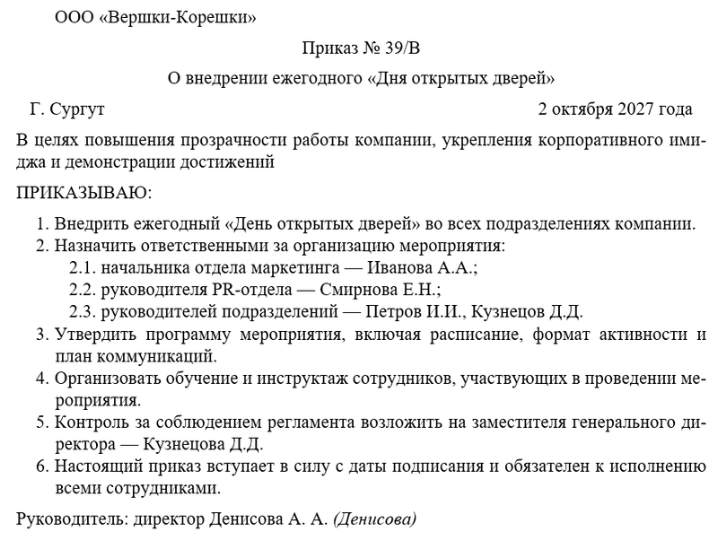 Приказ о внедрении ежегодного «Дня открытых дверей» должен быть оформлен в официально-деловом стиле, с четкой структурой и нумерацией пунктов. Формулировки должны включать «ПРИКАЗЫВАЮ», «ВОЗЛОЖИТЬ», «ОПРЕДЕЛИТЬ», чтобы закрепить обязательность исполнения документа.