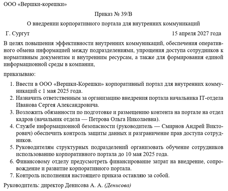Скачать в КонсультантПлюсБесплатный доступ к документуОбразец приказа о внедрении корпоративного портала для внутренних коммуникаций