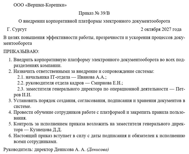 Приказ о внедрении корпоративной платформы электронного документооборота оформляется в официально-деловом стиле, с чёткой структурой и нумерацией пунктов. Формулировки должны включать слова «ПРИКАЗЫВАЮ», «ВОЗЛОЖИТЬ», «ОПРЕДЕЛИТЬ» для закрепления обязательности исполнения.