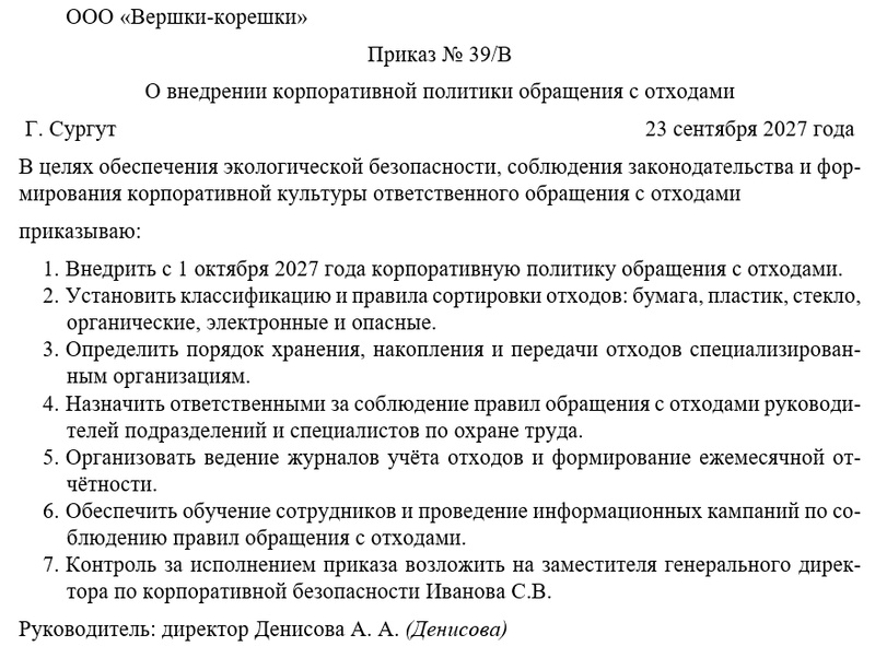 Приказ о внедрении корпоративной политики обращения с отходами позволяет компании минимизировать экологические риски, повысить эффективность управления ресурсами и укрепить положительный имидж перед сотрудниками, клиентами и обществом.
