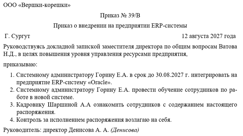 В распорядительной части фиксируются назначение ответственных лиц, сроки выполнения этапов и порядок взаимодействия подразделений. При необходимости указываются контрольные точки, порядок тестирования и приёмки системы. Приказ подписывается руководителем организации, визируется соответствующими службами и регистрируется. После доведения до сведения всех участников проект вступает в активную фазу. Соблюдение этих требований обеспечивает эффективное внедрение ERP-системы и достижение поставленных целей.