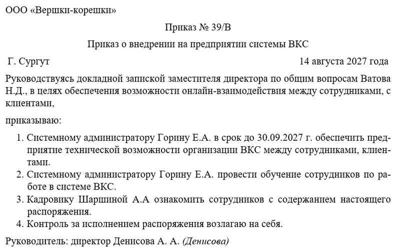 Приказ о внедрении системы видеоконференцсвязи является официальным документом, закрепляющим решение руководства и определяющим порядок действий. Он служит основанием для выделения ресурсов, привлечения сотрудников и организации взаимодействия между подразделениями. Приказ фиксирует сроки, ответственных лиц и цели проекта, что важно для контроля его выполнения.