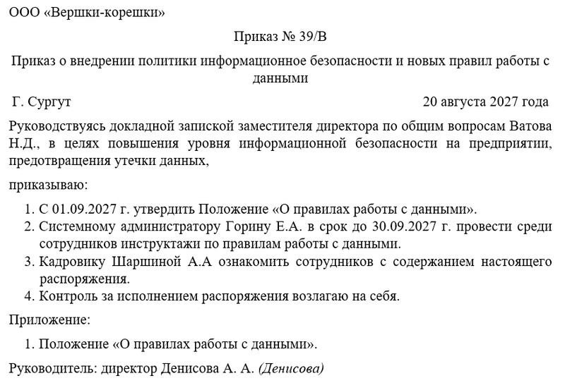 Приказ о внедрении политики информационной безопасности и новых правил работы с данными оформляется на фирменном бланке организации с указанием реквизитов. Во вводной части документа приводятся основания: результаты аудита, требования законодательства, рекомендации специалистов или решения совета директоров.