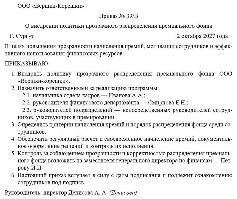 Скачать в КонсультантПлюсБесплатный доступ к документуОбразец приказа о внедрении политики прозрачного распределения премиального фонда
