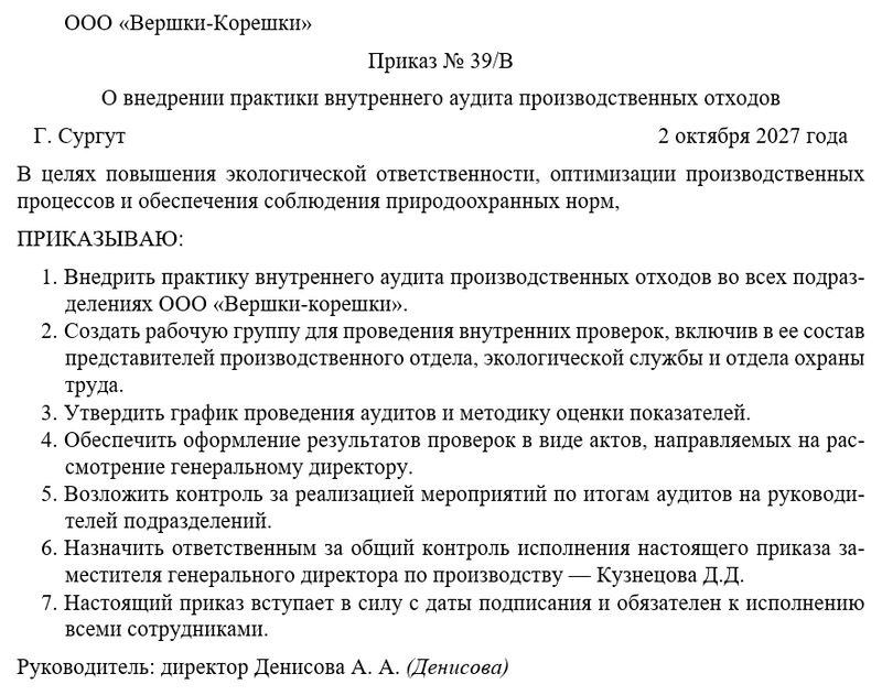 Приказ о внедрении практики внутреннего аудита производственных отходов — это нормативный документ, закрепляющий решение руководства компании о систематической организации внутреннего контроля за обращением с отходами, возникающими в процессе производственной деятельности. Для компании ООО «Вершки-корешки» данный приказ становится ключевым управленческим инструментом, направленным на укрепление экологической безопасности, повышение эффективности производственных процессов и минимизацию рисков, связанных с нарушением природоохранного законодательства.