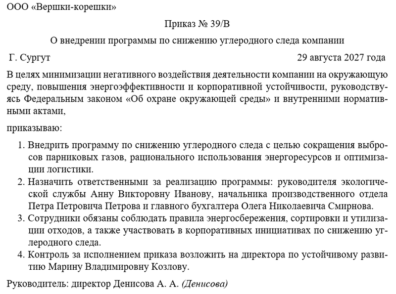 Приказ оформляется на фирменном бланке компании с указанием реквизитов и даты. Во вводной части фиксируются цели документа, нормативные основания и краткое описание программы по снижению углеродного следа.