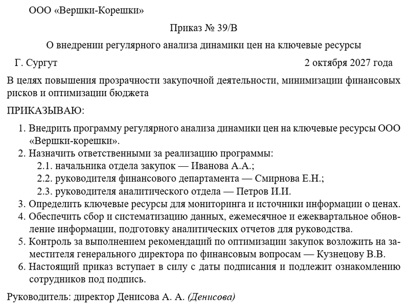 Приказ включает преамбулу, цели и задачи, распределение ответственности, методы и частоту анализа, а также порядок предоставления результатов руководству. В документе закрепляются: критерии выбора ключевых ресурсов, источники информации, формы аналитических отчетов и процедуры корректировки закупочной стратегии в зависимости от выявленных тенденций.
