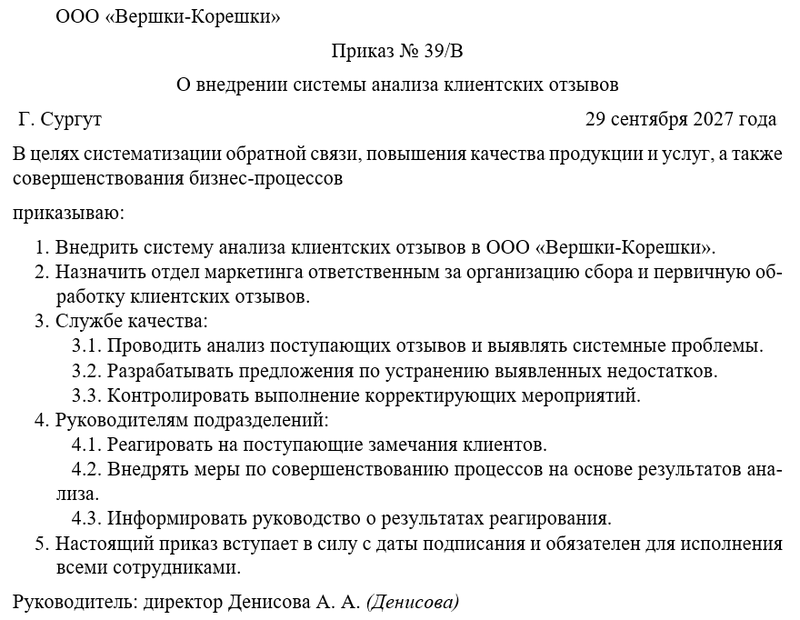 Приказ о внедрении системы анализа клиентских отзывов должен быть составлен на фирменном бланке компании, включать номер документа, дату подписания и подпись генерального директора.