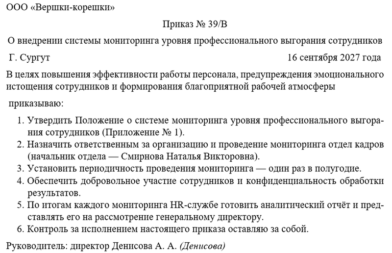 Приказ о внедрении системы мониторинга уровня профессионального выгорания сотрудников является важным инструментом управления персоналом. Он помогает компании контролировать эмоциональное состояние работников, снижать риски выгорания и обеспечивать более высокий уровень производительности.