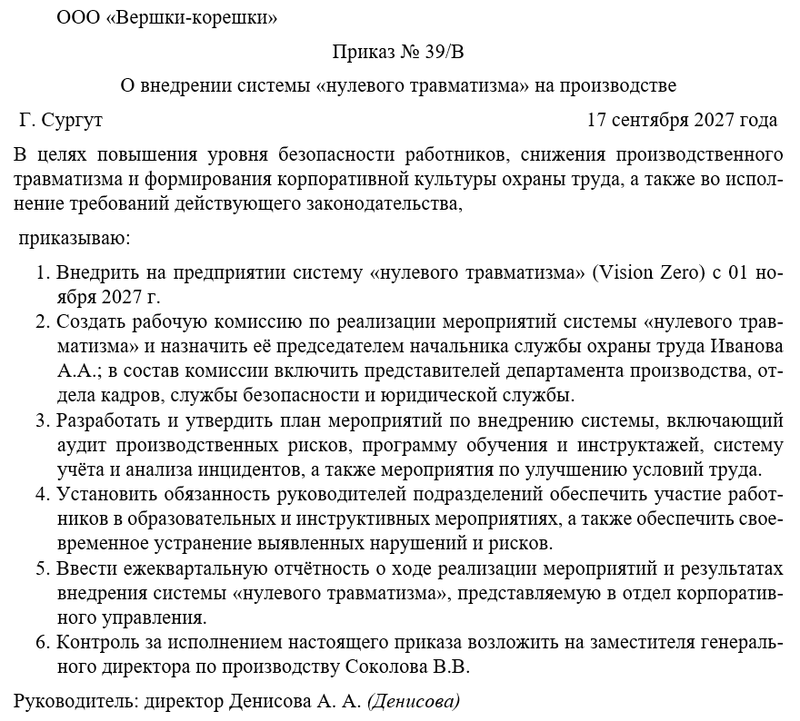 Приказ о внедрении системы «нулевого травматизма» на производстве — это внутренний нормативный акт, который официально фиксирует намерение организации перейти к системному управлению безопасностью труда с целью предотвращения всех несчастных случаев и профессиональных заболеваний. В документе обозначаются стратегические ориентиры компании в области охраны труда, назначаются ответственные лица и формализуется порядок организационной подготовки к реализации изменений. Такой приказ служит отправной точкой для формирования единой корпоративной политики, в которой безопасность рассматривается не как набор разрозненных мероприятий, а как основополагающая ценность производственной деятельности.