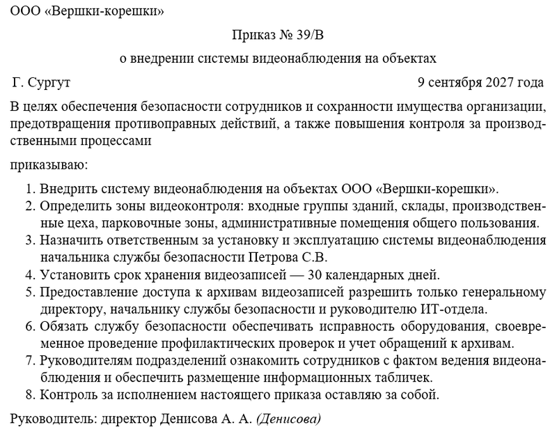 Таким образом, внедрение видеонаблюдения становится стратегическим шагом в повышении уровня безопасности и управляемости организации, а сам приказ служит основным документом, регулирующим применение данной системы.