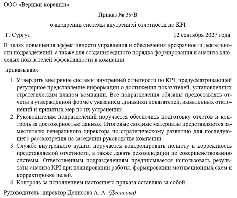 Бланк приказа о внедрении системы внутренней отчетности по KPI