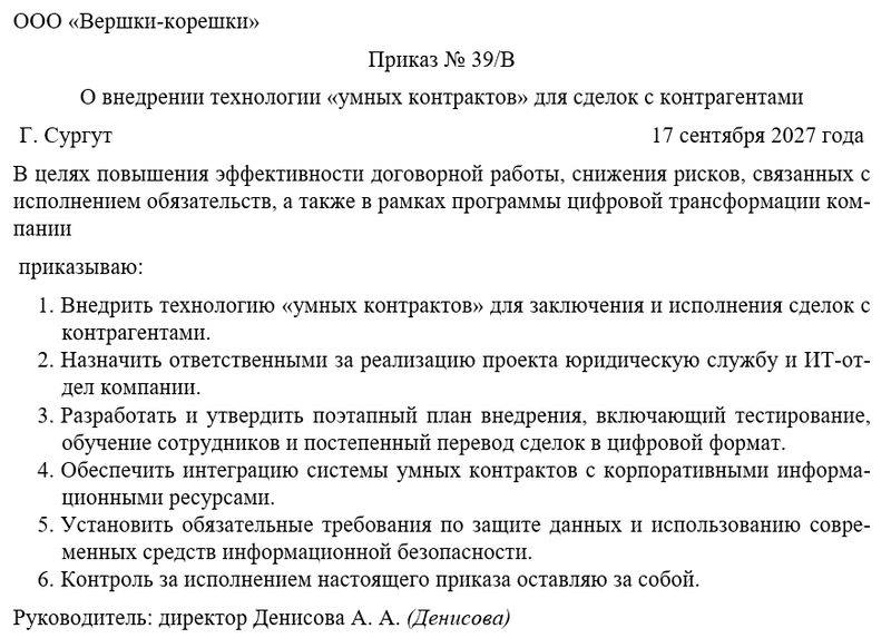С практической точки зрения приказ о внедрении технологии умных контрактов позволяет упорядочить процесс перехода к новым механизмам, закрепить ответственных лиц, определить сферу применения и регламентировать взаимодействие сотрудников с системой. Он создаёт правовую основу для интеграции таких решений в бизнес-процессы организации.