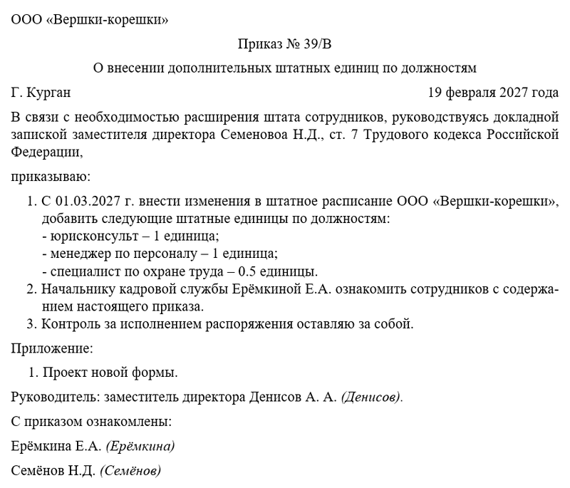Бланк приказа о внесении дополнительных штатных единиц по должностям