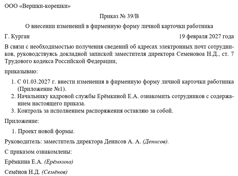 - с такого-то числа внести изменения в фирменную форму личной карточки работника;