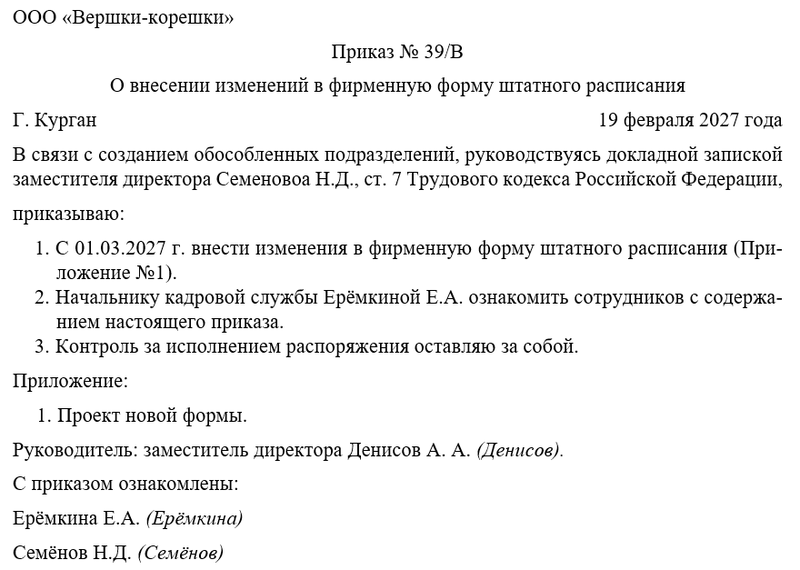 - с такого-то числа внести изменения в фирменную форму штатного расписания;