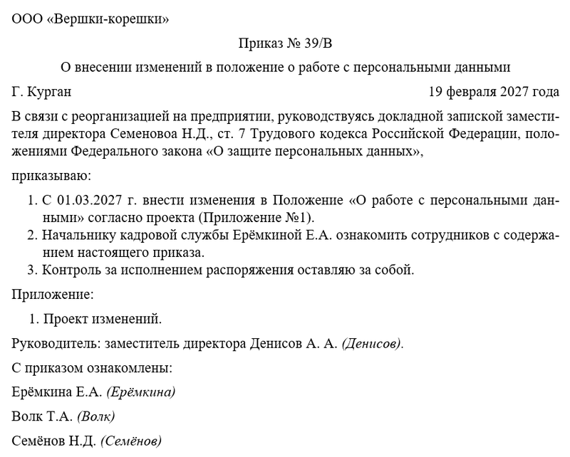 - с такого-то числа утвердить изменения в положение о работе с персональными данными;