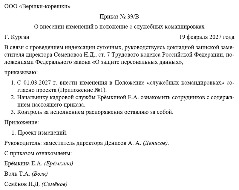 - с такого-то числа утвердить изменения в положение о служебных командировках;