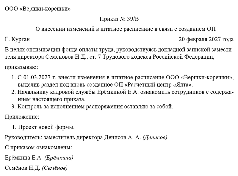 - с такого-то числа внести изменения в штатное расписание в связи с созданием нового ОП;