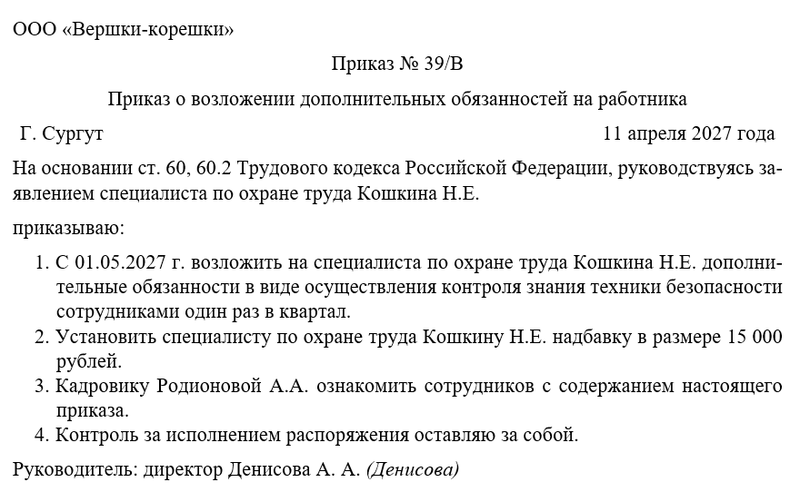 Следующим шагом руководитель объявляет о возложении дополнительных обязанностей на работника, а также назначает человека, который будет осуществлять контроль. Чаще всего контроль за исполнением распоряжения директор оставляет за собой.