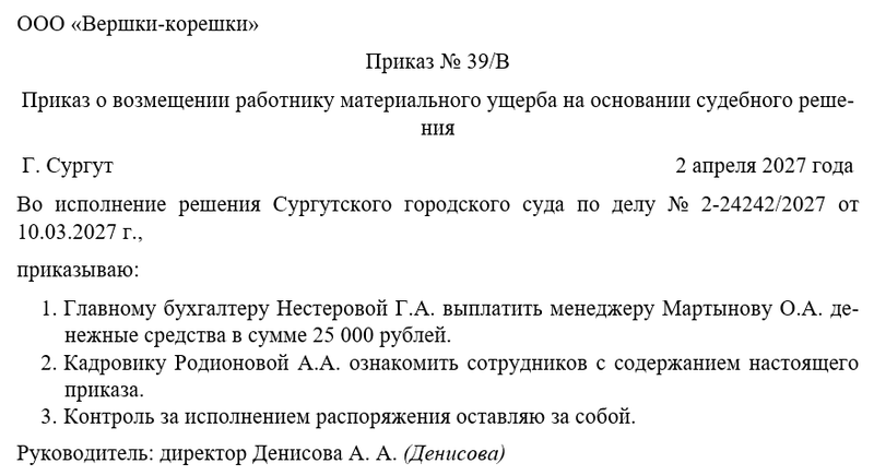 Следующим шагом руководитель объявляет о возмещении работнику материального вреда на основании вынесенного и вступившего в силу судебного решения, а также указывает на человека, который будет осуществлять контроль. Чаще всего контроль за исполнением распоряжения директор оставляет за собой.