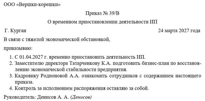 Этот документ служит официальным основанием для приостановления, но, в отличие от юридических лиц, ИП не издает внутренних приказов, так как он действует как физическое лицо.