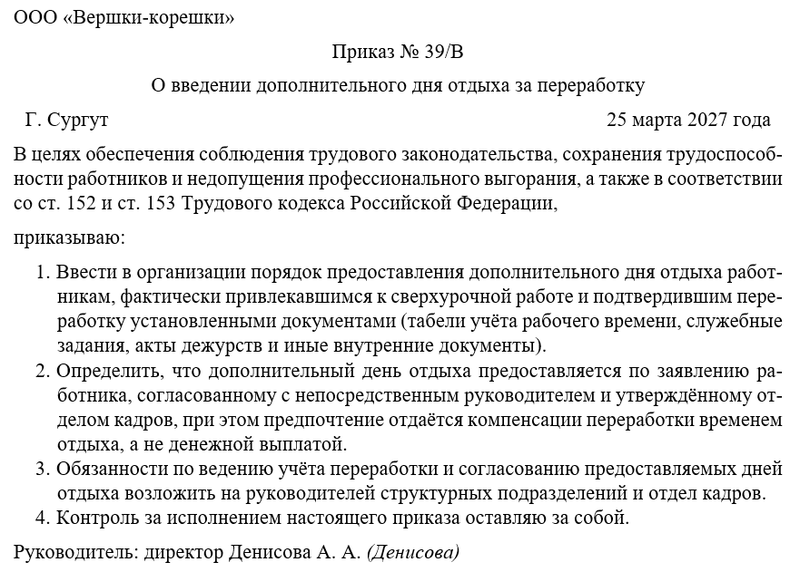 Бланк приказ о введении дополнительного дня отдыха за переработку