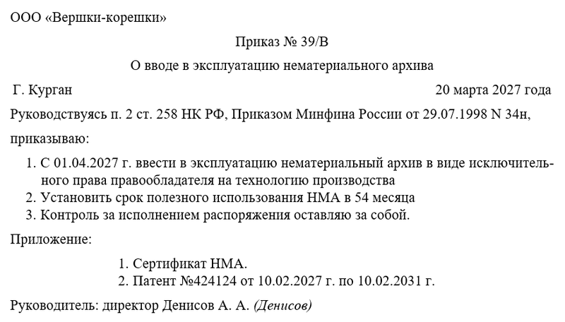 Следующим шагом руководитель утверждает ввод в эксплуатацию нематериального актива, раздает подчинённым соответствующе распоряжения, возлагает ответственность за исполнение приказа, а также человека, который будет осуществлять контроль. Чаще всего контроль директор оставляет за собой.