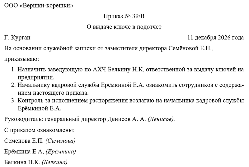 - назначить такого-то сотрудника ответственным за выдачу ключей на предприятии;